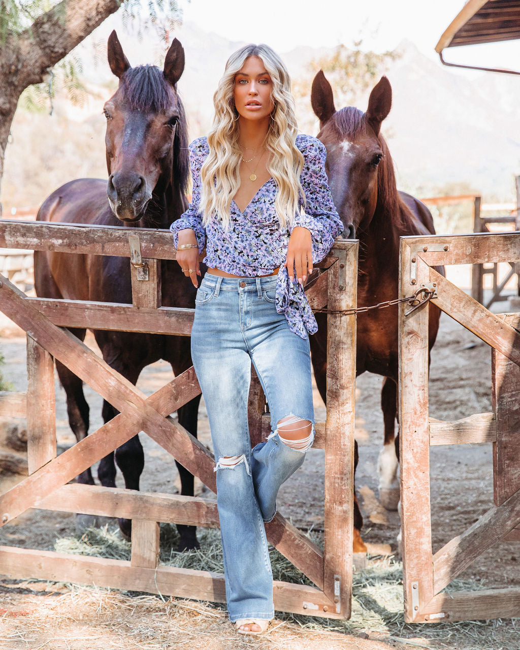 ////Best Selling Silhouette// We're digging the femme vibes of our Francine Chiffon Ruffle Wrap Blouse! Periwinkle. dusty blue. sage. blush. and white florals make up this true wrap blouse. Styled with the Perfect Hoop Earrings. 5 Disc Choker. Chloe Mini Necklace. Ritual Pendant Necklace. Wander Often Rattan Crossbody Handbag. Bella High Rise Flare Denim. and Lidia Square Toe Heeled Raffia Mule.