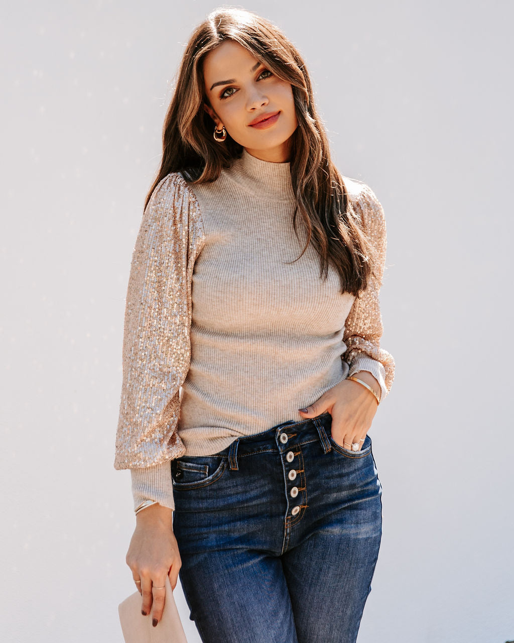 Try a shimmering sleeve for your next party look! Our From A Dream Sequin Mock Neck Knit Top is oatmeal with contrast sequin sleeves. Detailed with a mock neckline and ribbed edges. Styled with the Mercury Hoops. Simple Bangle Bracelet. Stella Crossbody Envelope Zip Clutch. Nashville High Rise Skinny. and Formal Faux Suede Heel.