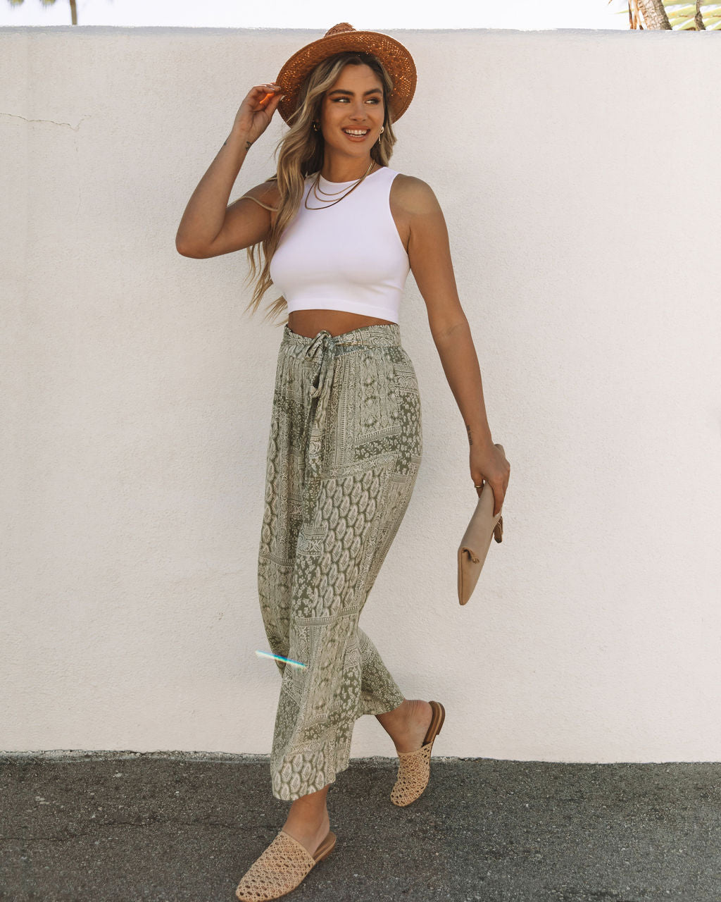 Styled with: Velasco Hat. Mercury Hoops. Zoe Necklace. Stella Clutch. Kiki Top. and Merly Mule.