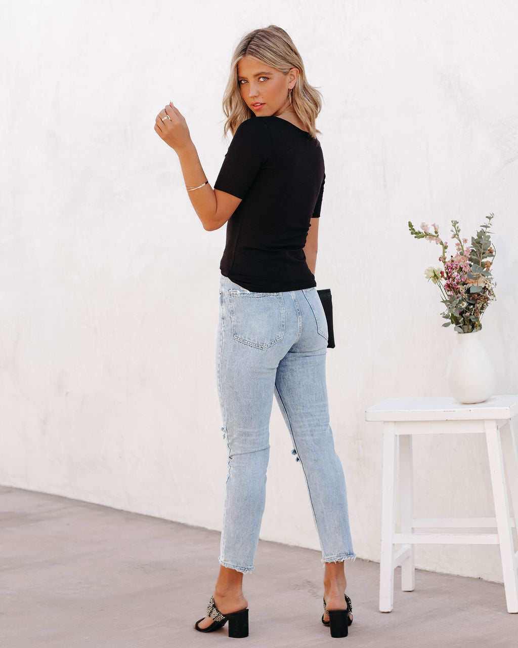 Made in the softest fabric ever. the Georgina Cotton Square Neck Top in black is the easiest weekend style with half sleeves and a stretchy style.