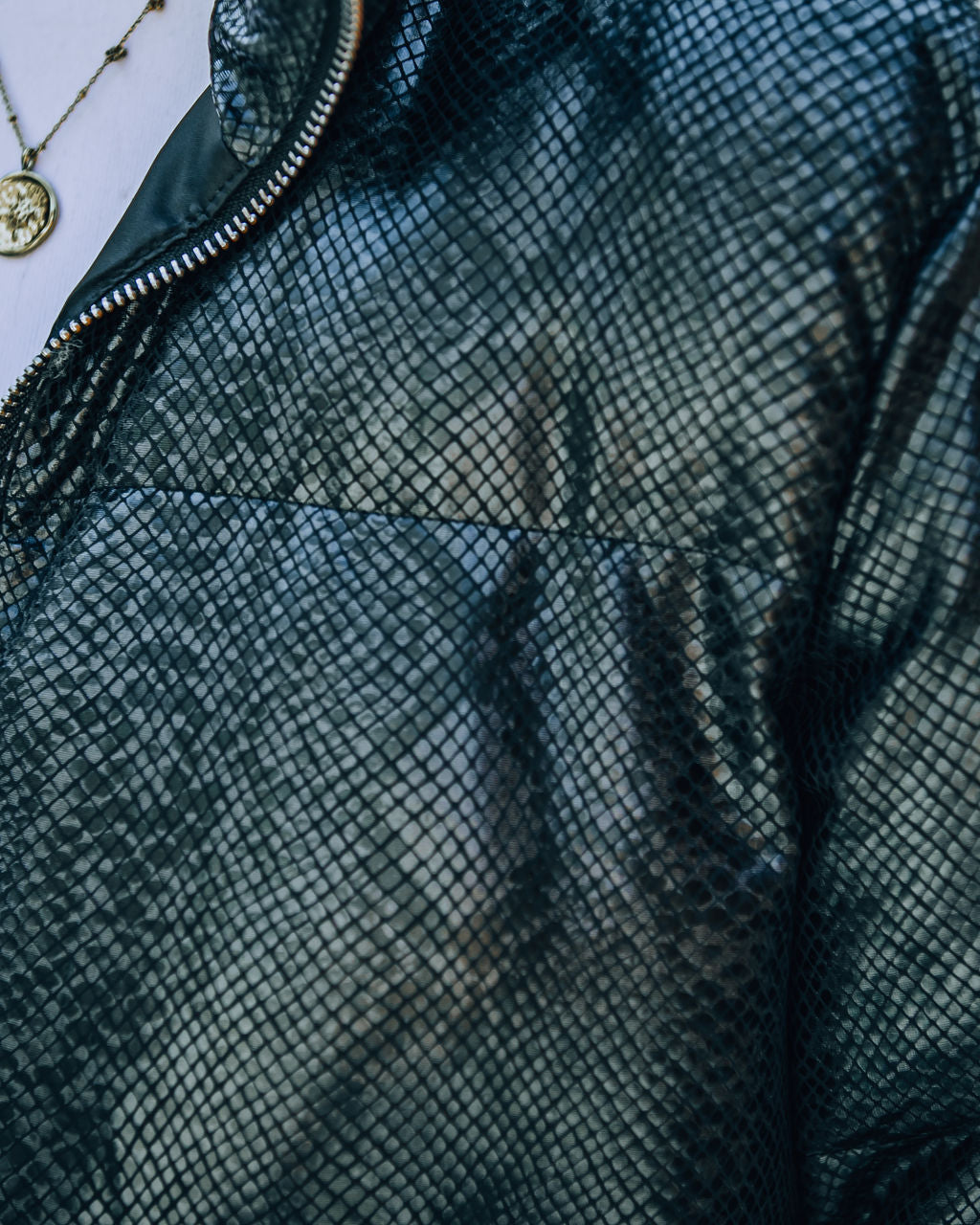 Keep it sleek and chic in our Giada Pocketed Python Puffer Jacket! This black embossed jacket features side pockets and an inner adjustable tie closure. Secured with a front zipper closure. Styled with the Carson Black Frame Dark Smoke Polarized Sunglasses. Chloe Mini Necklace. Compass Coin Necklace. Simple Bangle Bracelet. Highland Bag. Kiki Knit Crop Top. Volt High Rise Distressed Skinny. and Brycen Faux Leather Lace Up Boot.