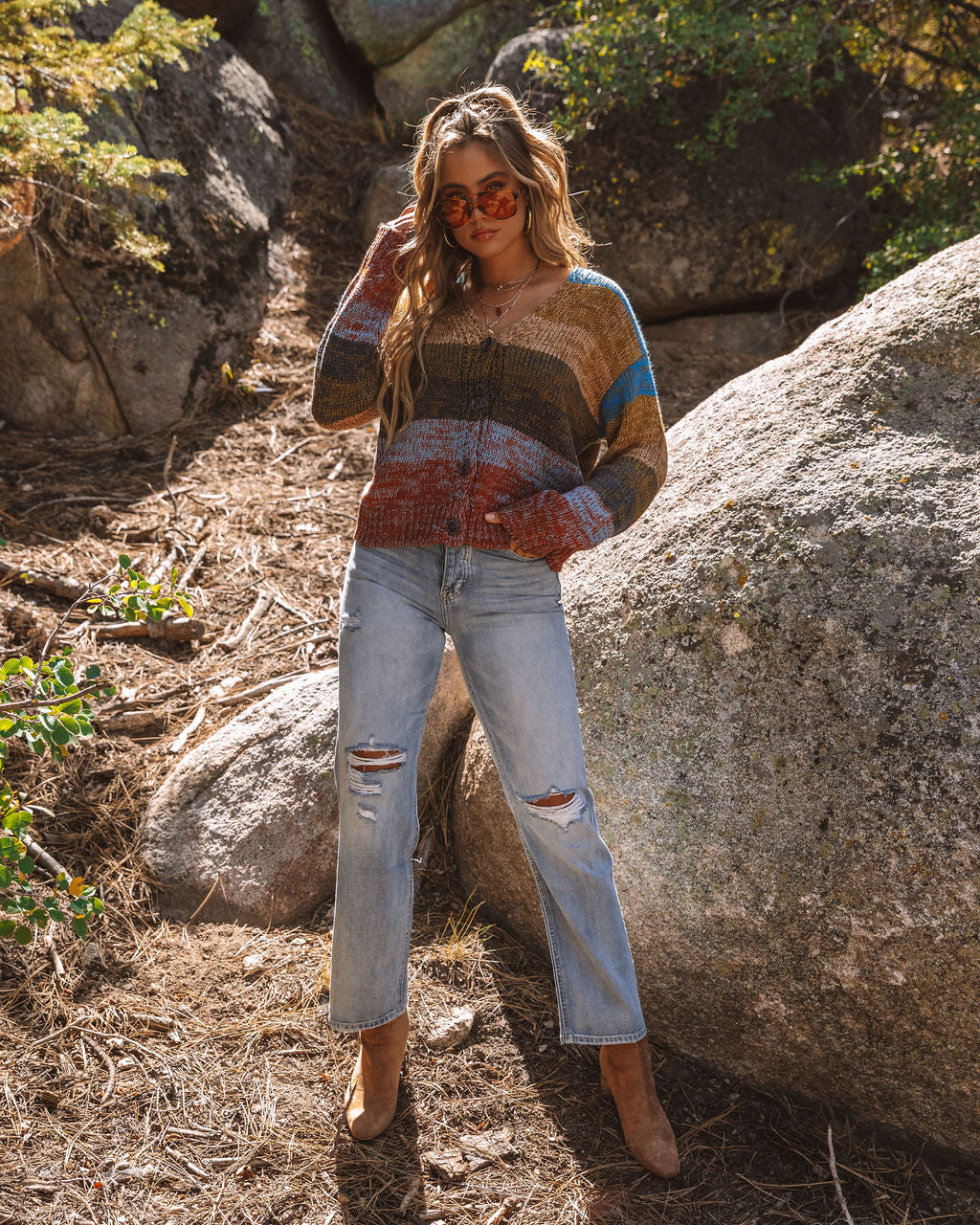 Our Graham Striped Button Front Knit Cardigan delivers retro vibes! Blue. mustard. olive. navy. and rust stripes make up this button front piece. Style this 70's inspired sweater with a hat and suede booties. Styled with the Zoey Hoops. Coasta Layered Pendant Necklace. Jadine High Rise 90's Boyfriend Denim. and Colby Faux Suede Heeled Bootie.