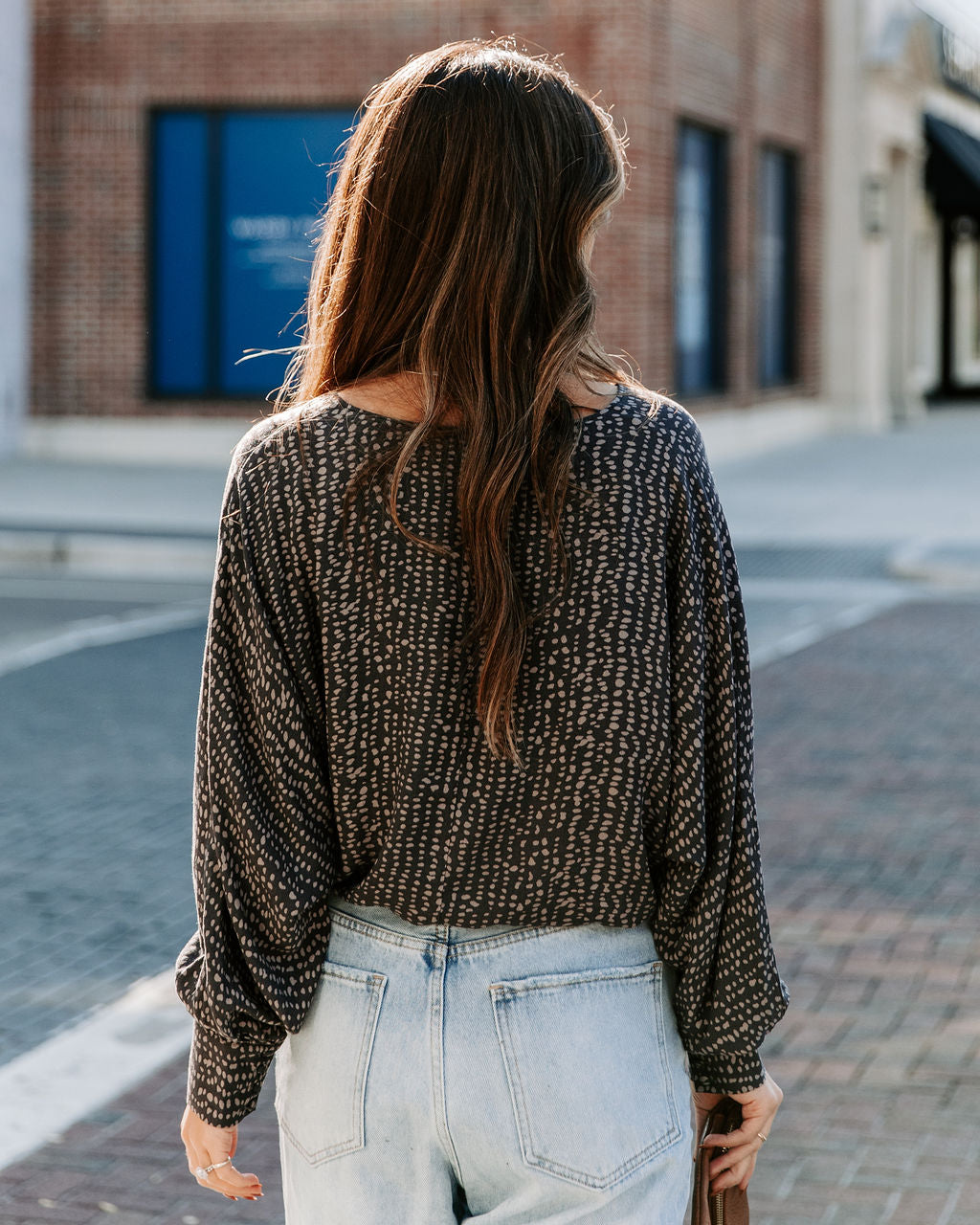 Grandview Printed Drawstring Drape Blouse - Charcoal