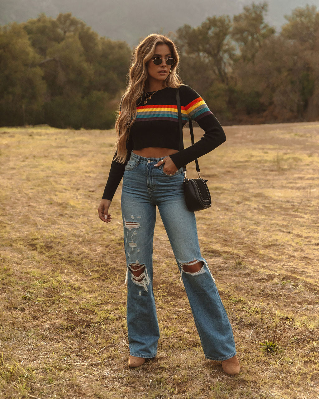 Bring it back to the 80's in our Growing Pains Ribbed Knit Top! This black ribbed tip features orange. yellow. grey. blue. and purple horizontal stripes. Designed with a crew neckline and long sleeves. Styled with the Empire Large Hoops. Emperor Coin Necklace. Central Park Crossbody Bag. Leslie High Rise 90's Flare Denim. and Colby Faux Suede Heeled Bootie.