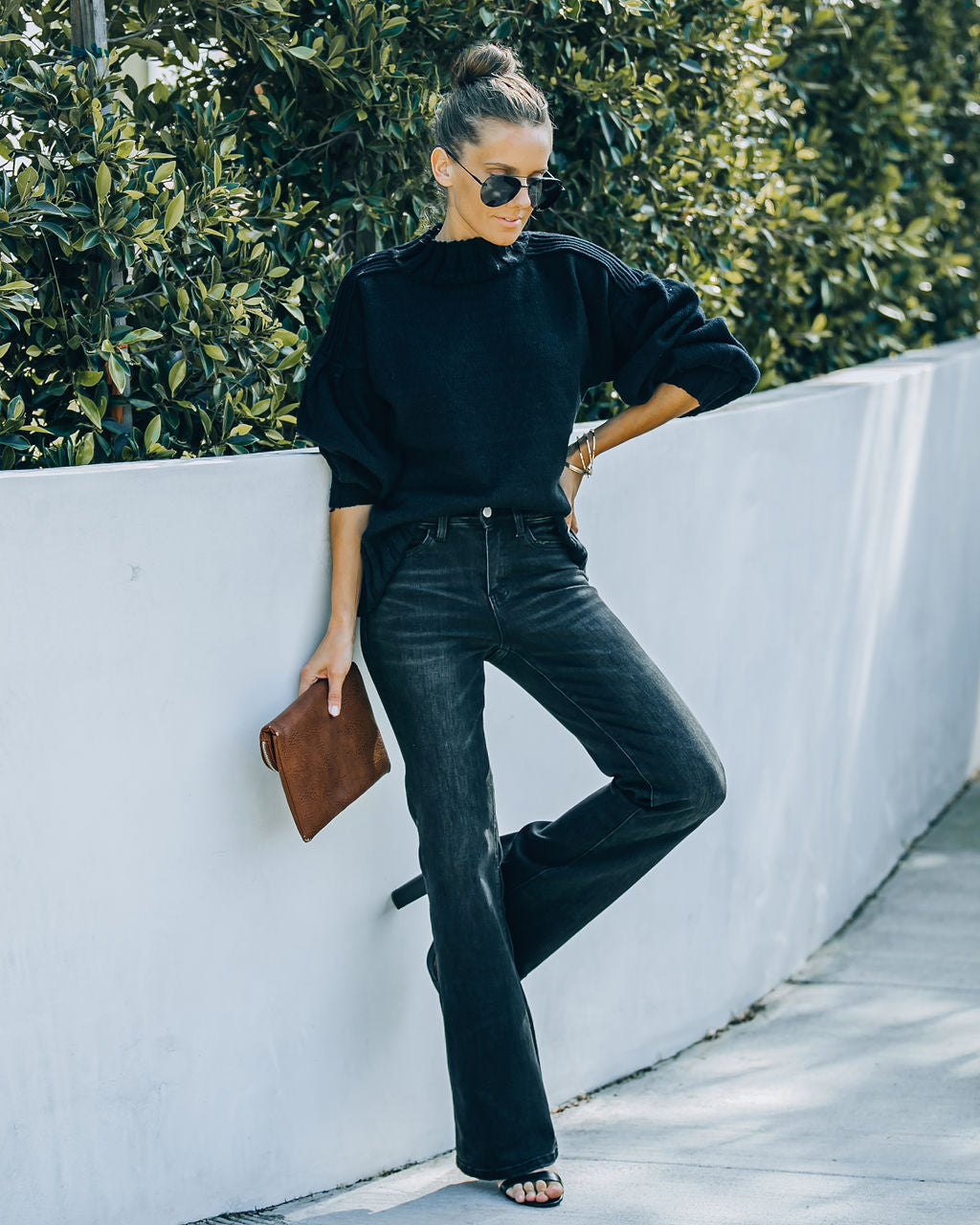 Flare denim is BIG right now! Our Laurel High Rise Relax Flare Denim comes in a faded black hue. Designed with a flared leg and a stretchy fabrication. Finished with front fly zipper and button closures. Styled with the Lenox Black Frame Grey Gradient Aviator Sunglasses. Simple Bangle Bracelet. Stella Crossbody Envelope Zip Clutch. Bundle Up Ribbed Knit Sweater. and Whimsy Heel.