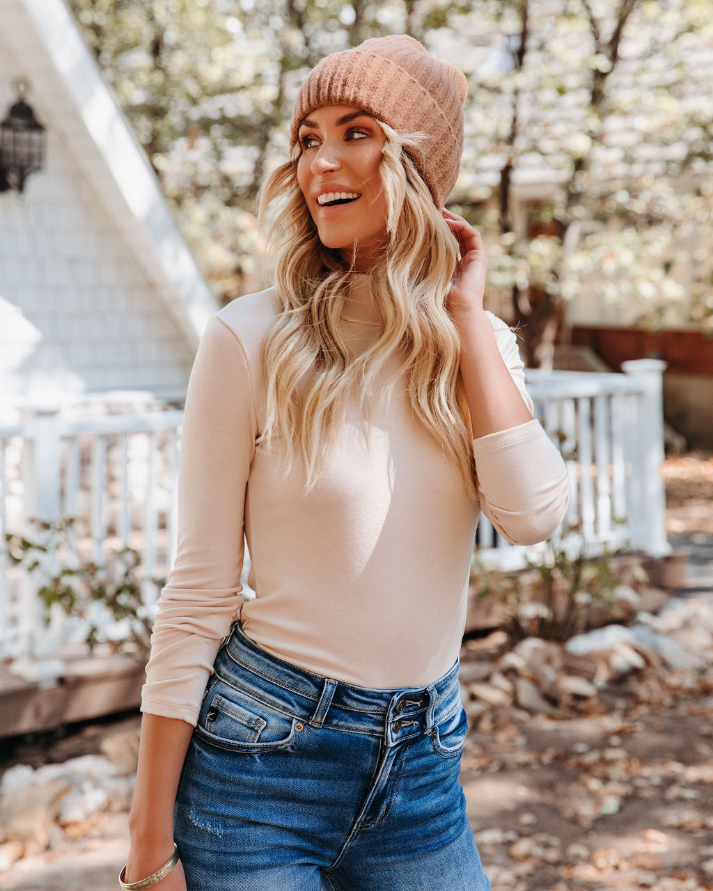 The name says it all! Layer our Layer It Mock Neck Knit Top under blazers and cardis. This ecru colored top features a mock neckline and a fitted style. The ideal fall to winter top! Styled with the Chilly Ribbed Beanie. Perfect Hoop Earrings. Simple Bangle Bracelet. Kenzie Backpack. Hannah High Rise Straight Leg Denim. and Uptown Faux Suede Heeled Bootie.