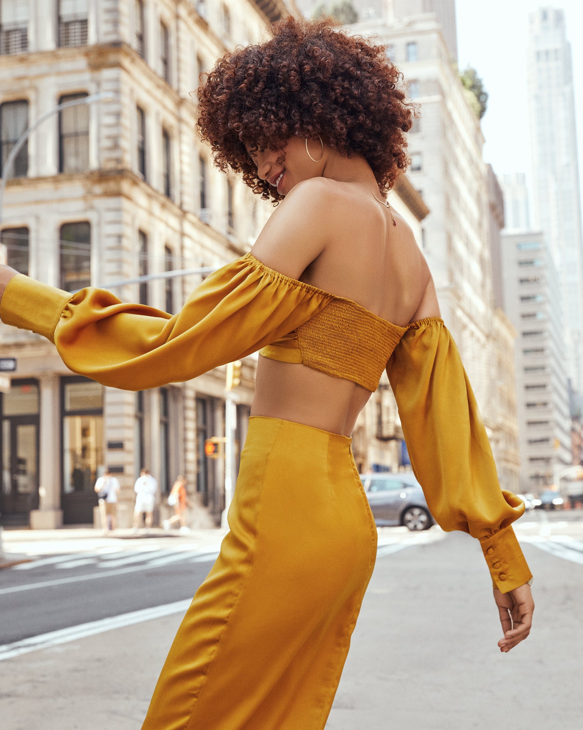 There's nothing more stunning than a satin set! Our Leah Satin Long Sleeve Crop Top comes in a luxe gold hue. Designed with a back smocked bust. This top can be worn on or off the shoulder. Styled with the Perfect Hoop Earrings. Minimal Herringbone Necklace. Simple Bangle Bracelet. Harper Woven Faux Leather Handbag. Leah Satin Midi Skirt. and Ritz Faux Suede Pointed Heel.