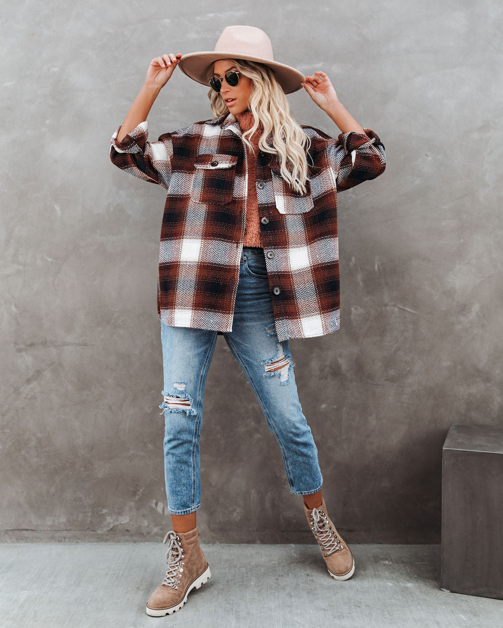 We can't get enough plaid shackets this season! The Liles Plaid Button Down Wool Blend Shacket comes in a camel. black. taupe and ivory plaid print with a collar and side slits. Finished with front pockets and front button closures. Throw this ultra trendy shacket on over your favorite turtleneck and denim and hit the mountains for some exploring! Styled with the El Dorado Hat. Adam Fuzzy Sleeveless Knit Top. Sofia Distressed High Rise Denim. and Arlene Faux Suede Lace Up Boot.
