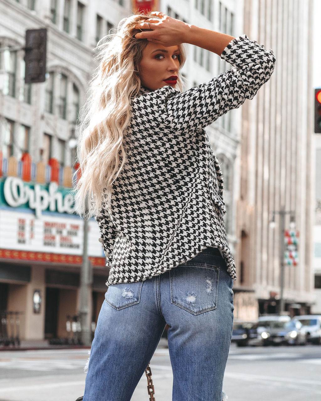Go for a French Girl vibe in the Lincoln Pocketed Houndstooth Tweed Blazer in black and white complete with frayed edges and a shawl neckline.