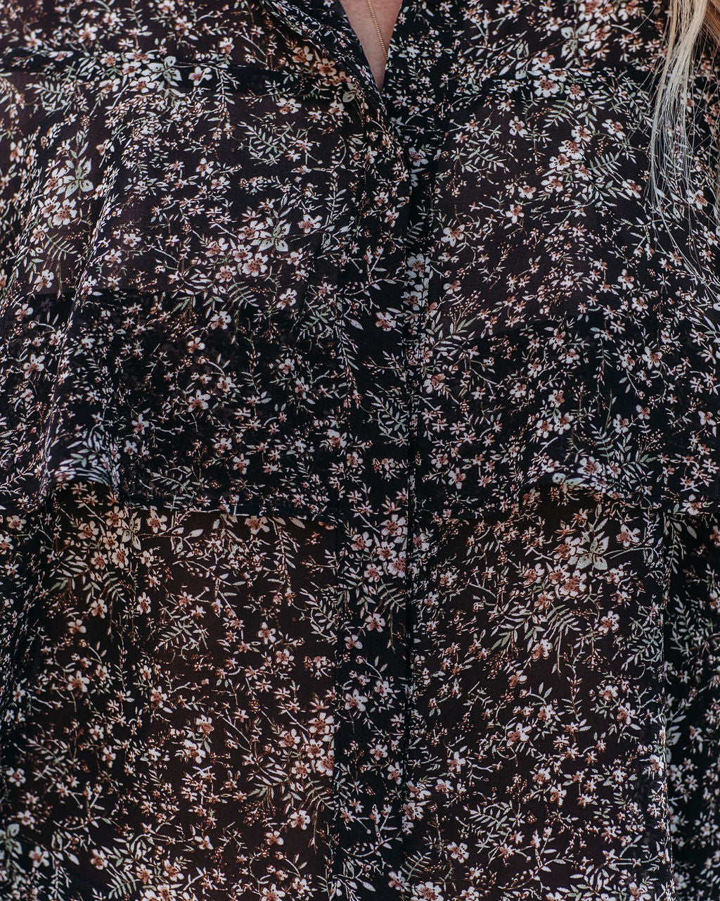 Our Loyalty Floral Ruffle Crop Blouse is patterned to perfection! Black. white. sage. and brown florals make up this cropped blouse. Designed with a collar and ruffle details throughout. Styled with the Rocky Mountain Hat. Minimal Herringbone Necklace. 5 Disc Choker. Simple Bangle Bracelet. Stella Crossbody Envelope Zip Clutch. Maple High Rise Bell Bottom Denim. and Jocelyn Heeled Bootie.