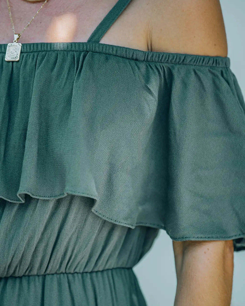 Shop around town in our Maelynn Cold Shoulder Jumpsuit! This olive cold shoulder piece is designed with adjustable straps and a wide pant leg. Pair this breezy number with nude sandals. Styled with the Chloe Mini Necklace. Minimal Herringbone Necklace. Initial Card Necklace. Simple Bangle Bracelet. Stella Crossbody Envelope Zip Clutch. and Whimsy Heel.