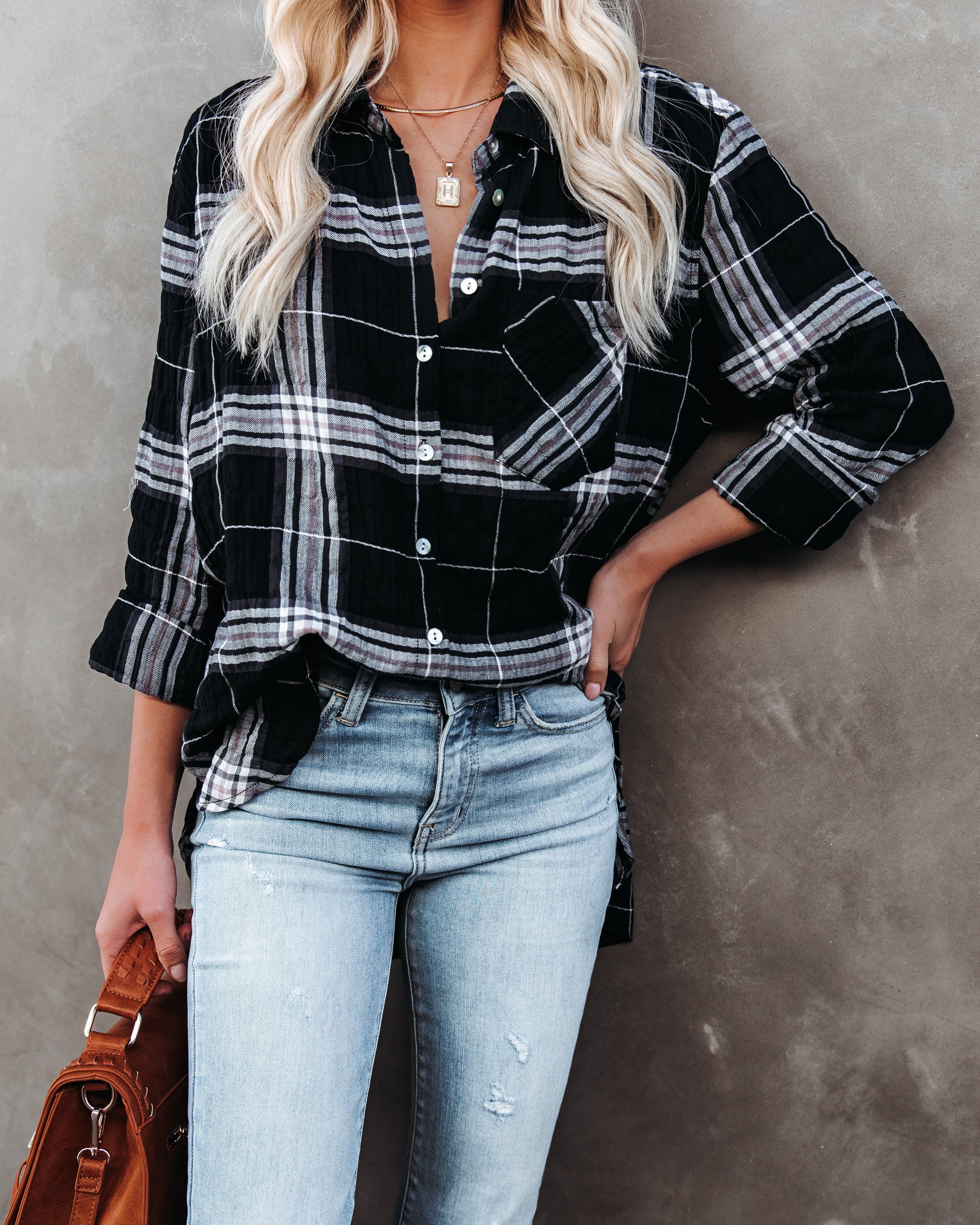 A cool boyfriend plaid in black. ivory and nude covers the Melancholy Plaid Button Down Top! Take a chill moment in the laid back and relaxed fit. roll up sleeves and rounded hemline. A button down front keeps this top versatile as a layering piece or can be worn on its own!