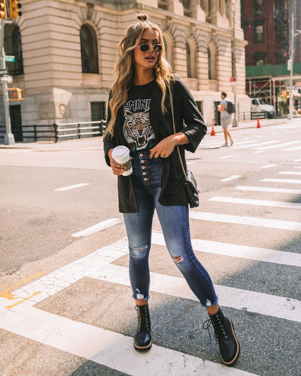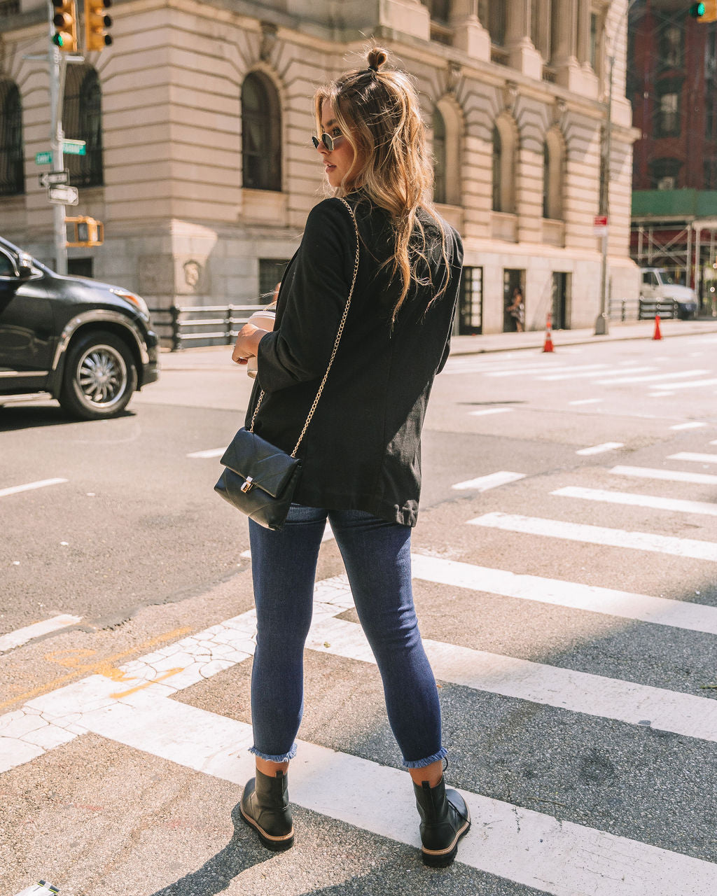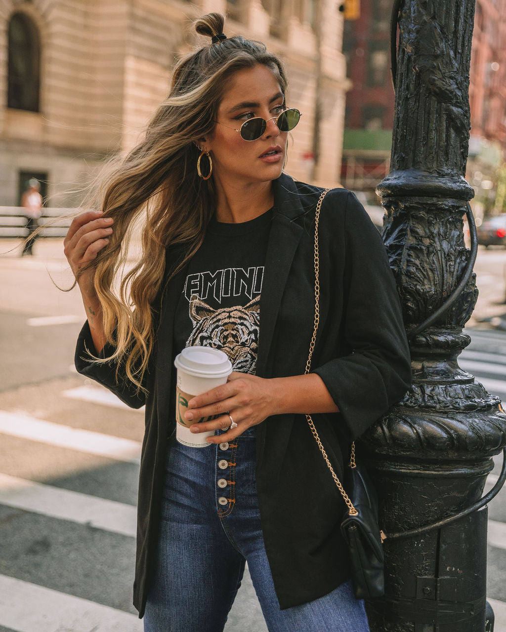 //InsStreet Exclusive// Every Fall wardrobe needs a polished blazer! Our Moore Cotton Pocketed Blazer comes in black. Designed with a notched collar and sewn cuffed sleeves. Finished with side pockets. Styled with the Empire Large Hoops. Samantha Quilted Chain Crossbody Bag. Feminine Then Fierce Cotton Tee. Tilley Frayed Ankle High Waisted Skinny. and Brycen Faux Leather Lace Up Boot.