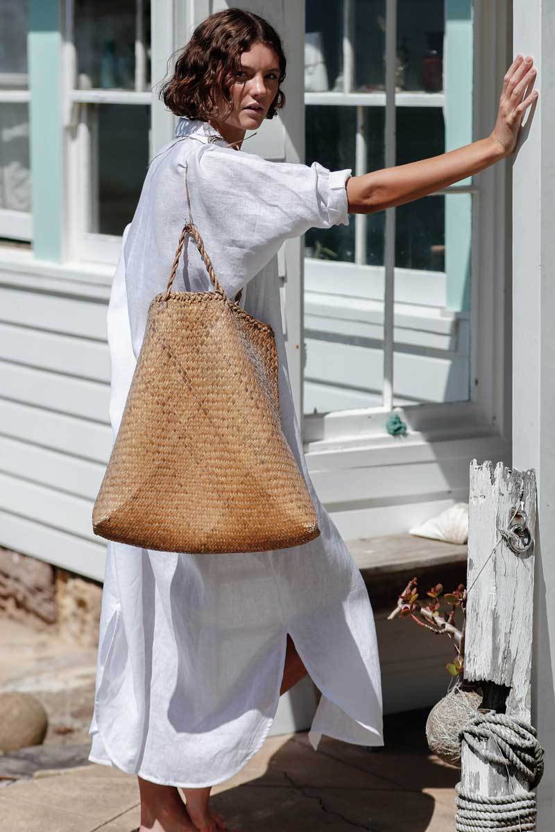 Our Morada Pocketed Satin Midi Shirt Dress easily goes from work to weekend! This ivory satin button down midi is detailed with a collar and long sleeves. Dress it up with heels or down with booties! Styled with the El Dorado Hat. Perfect Hoop Earrings. Chloe Mini Necklace. Mosaic Coin Necklace. Harper Woven Faux Leather Handbag. and Uptown Faux Suede Heeled Bootie.
