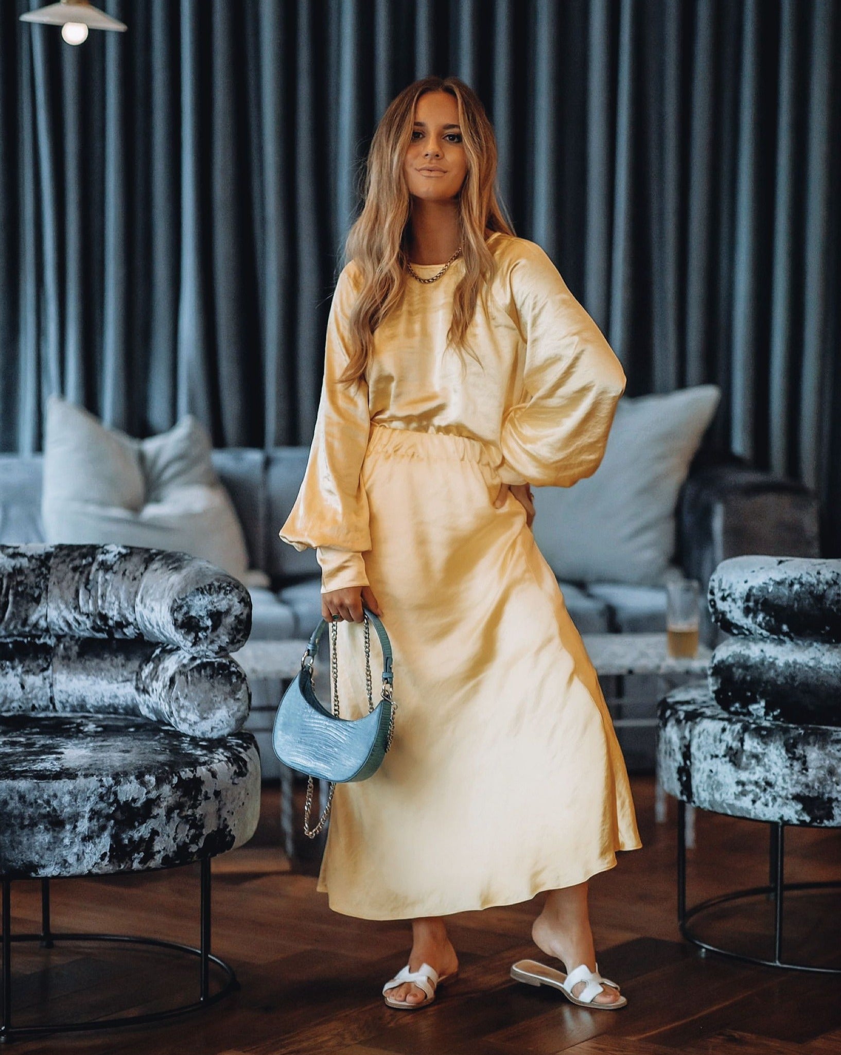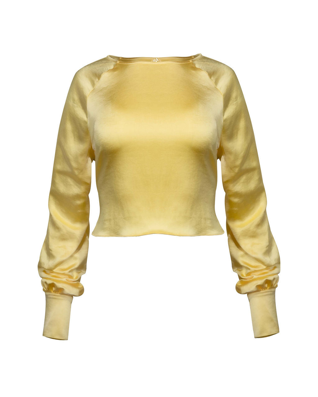//// Primary colors are the hottest trend this season! Our Naya Satin Crop Blouse comes in yellow. Designed with a crew neckline and long sleeves. Secured with a back necktie closure. Styled with the Naya Satin Midi Skirt.