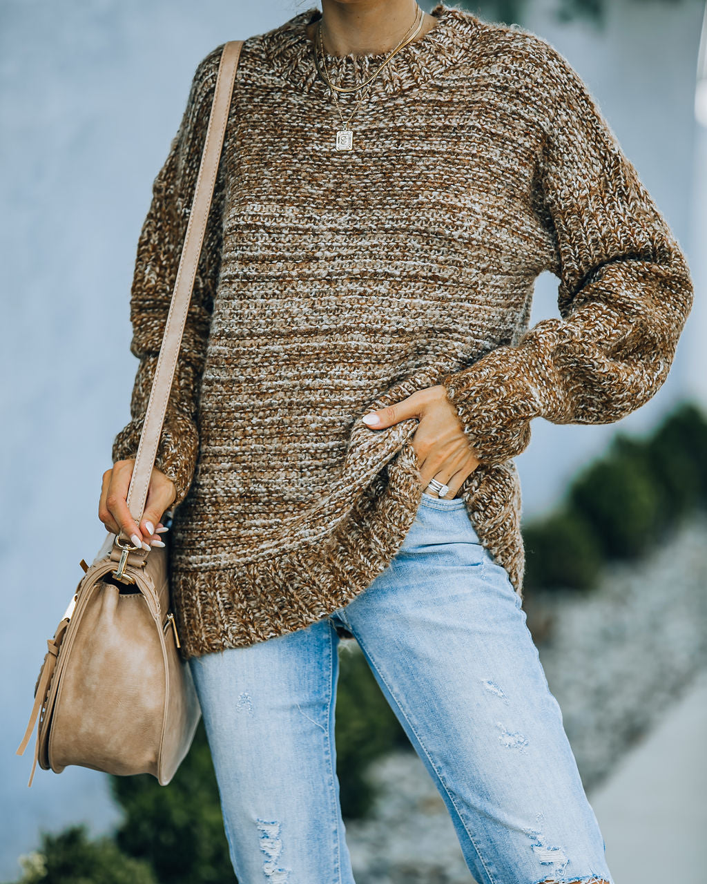 Cozy up all season long in our Nicoletta Knit Sweater! This brown. mocha. and ivory ultra thick knit sweater features ribbed edges. Designed with a high neckline and long sleeves. Styled with the Minimal Herringbone Necklace. Initial Card Necklace. Highland Bag. Mcguire High Rise Distressed Denim. and Finley Faux Leather Bootie.
