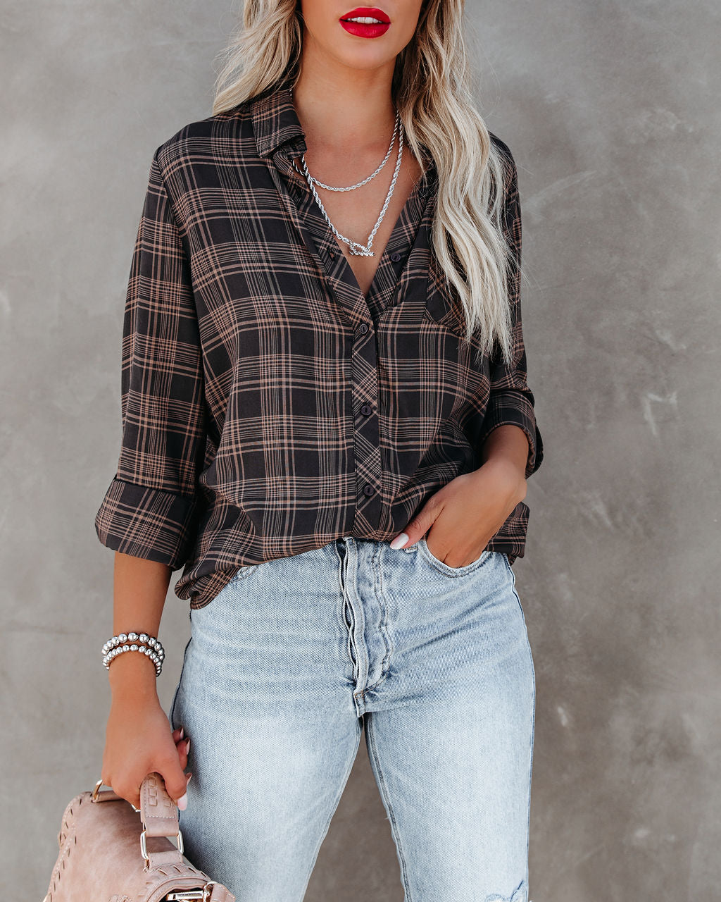 Our Night Owl Plaid Button Down Top is a fall favorite! This charcoal and taupe plaid top is designed with roll-tab sleeves. Finished with a bust pocket. Wear this top with distressed denim. Styled with the Memorable Beaded Bracelet Set. Harding Layered Toggle Chain Necklace. Highland Bag. Kason Distressed High Rise Denim. and Finley Faux Leather Bootie.