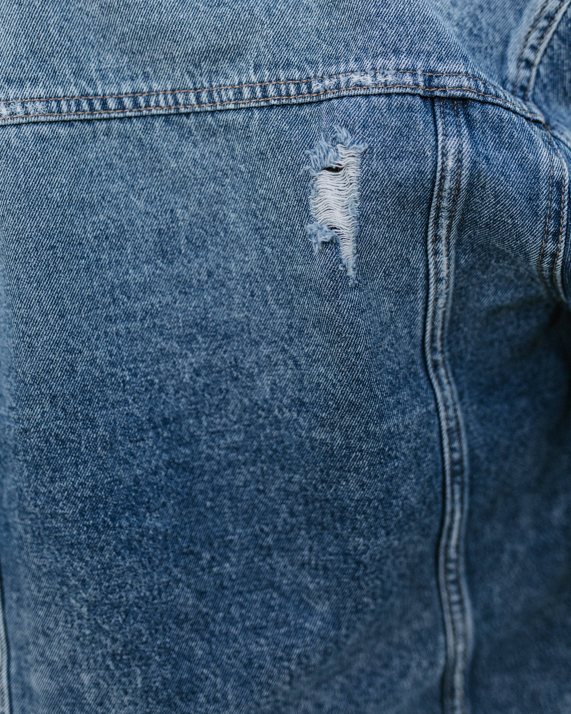 //Best Seller//Vervet Denim// Our Night Rider Pocketed Distressed Denim Jacket gives your look a trendy edge. This essential denim jacket features a medium wash and a relaxed fit. We kept it classic with a collar. long sleeves and four functional pockets. Heavy distressing throughout and a frayed hem elevates the look! An unmatched styling staple to wear for seasons to come. Styled with the Decadence Adjustable Tank. Classic Zip Skinny. Royale Heels and the Stella Crossbody Envelope Zip Clutch.