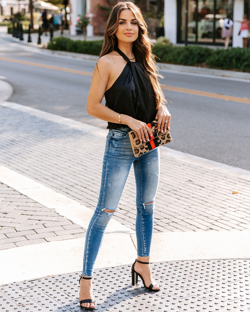 Styled with: Mercury Hoops. Minimal Herringbone Necklace. Simple Bangle. Best Behive-ior Clutch. Sicily Skinny. and Whimsy Heel.