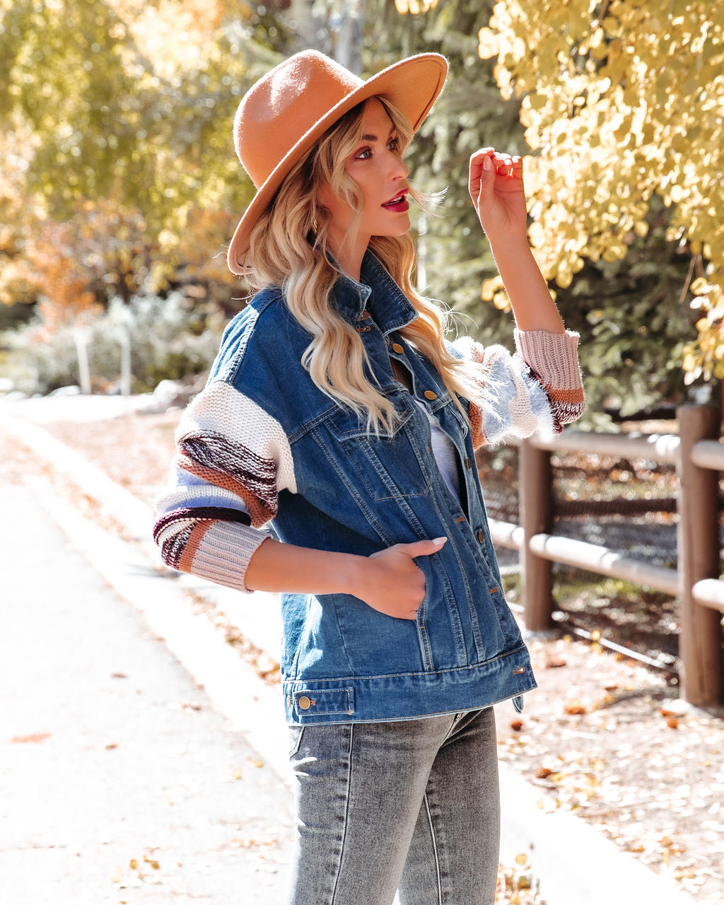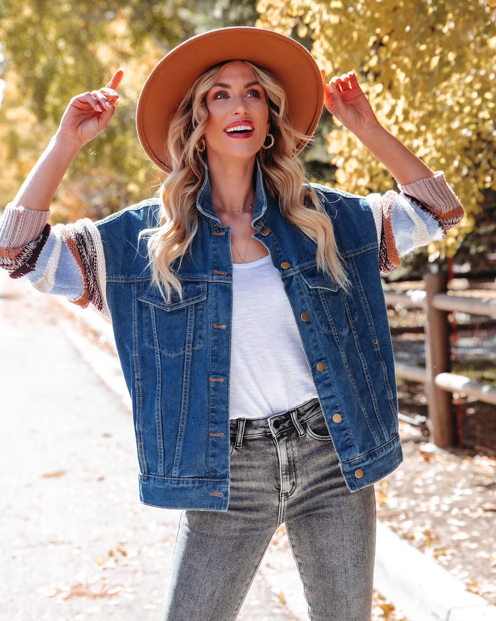 Not your basic denim jacket! Our Rockie Pocketed Knit Sleeve Denim Jacket in dark wash is spiced up with cream. burgundy. rust. sky blue. and mauve contrast sleeves. Finished with bust and side pockets. Styled with the El Dorado Hat. Tahiti Hoops. Crystal Droplet Choker. The Buddha Wheel Necklace. Highland Bag. Physique Racerback Tank. Population High Rise Skinny. and Teagan Faux Leather Heeled Slouch Boot.