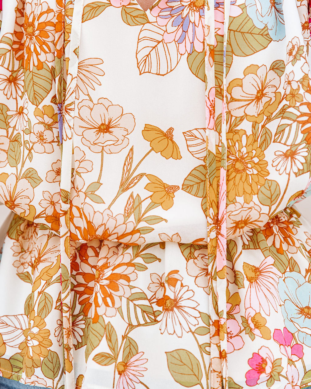 Sunday brunch is what our Shake It Off Floral Peplum Blouse is made for! This ivory blouse features florals in lime. pink. fuchsia. sky blue. mustard. orange. and cream. Designed with flutter sleeves and a peplum waist. Styled with the French Twist Hoops. 5 Disc Choker. Moxie Simple Chain Necklace. Initial Card Necklace. Simple Bangle Bracelet. Stella Crossbody Envelope Zip Clutch. Demand High Rise Distressed Skinny. and Whimsy Heel.