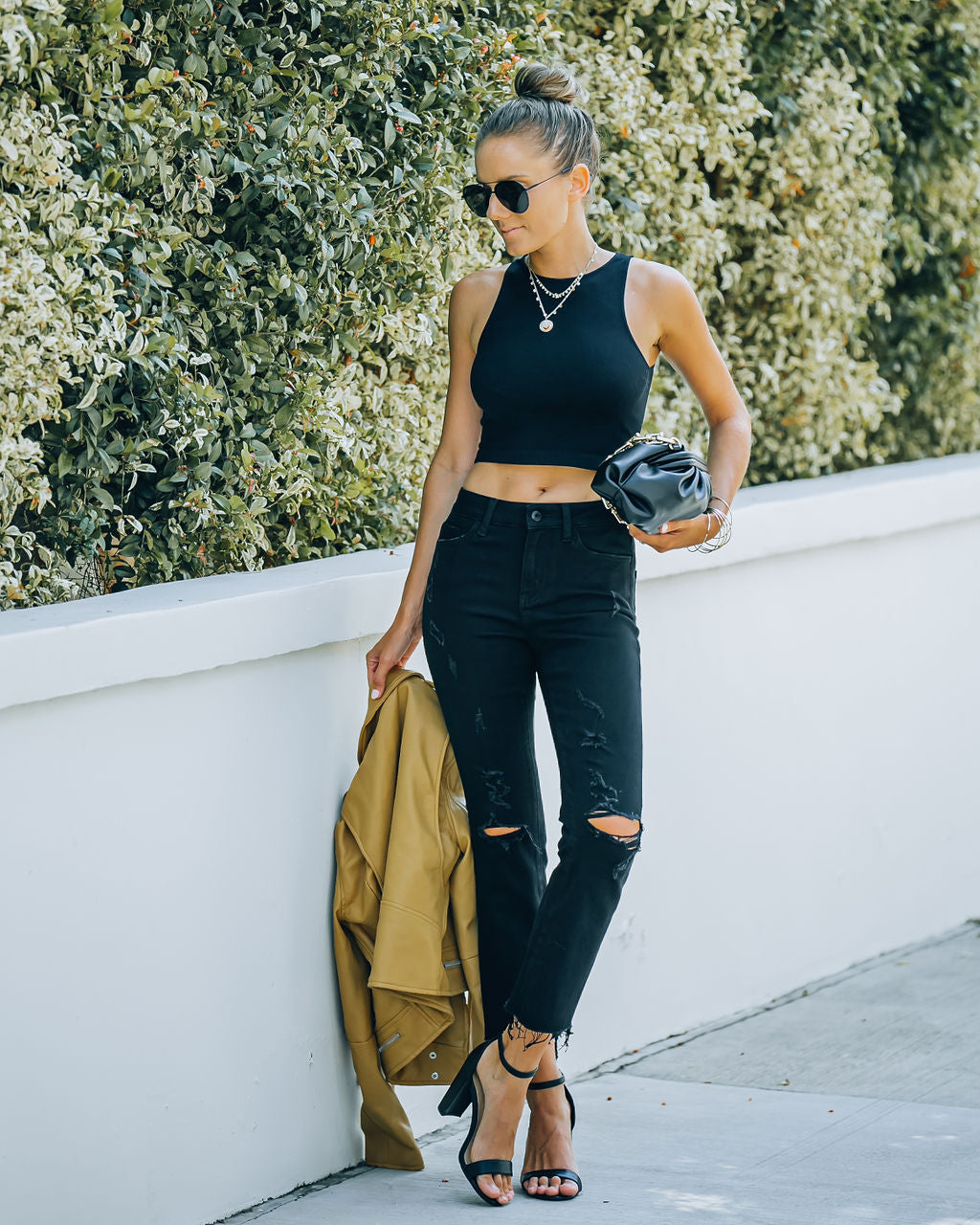 ////Best Selling Silhouette//New Wash// Every wardrobe needs classic black denim! Our Sharma High Rise Distressed Denim are designed with a high rise and a light distressing. Secured with a zipper and button closure. Styled with the Chloe Mini Necklace. Judah Pendant Disc Necklace. Simple Bangle Bracelet. Chic Crossbody Chain Pouch Bag. Kiki Knit Crop Top. Gramercy Pocketed Faux Leather Moto Jacket. and Whimsy Heel.