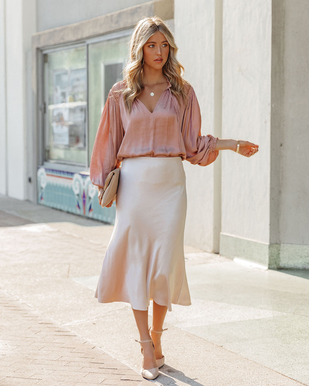 Silk skirts look so chic in the office! Our Shawn Satin Midi Skirt comes in a lustrous champagne hue. Designs with an elastic waistband and no closures. Wear this midi with a collared blouse and heels. Styled with the Perfect Hoop Earrings. 5 Disc Choker. Chloe Mini Necklace. Gaia Coin Necklace. Simple Bangle Bracelet. Commitment Satin Blouse. Stella Crossbody Envelope Zip Clutch. and Ritz Faux Suede Pointed Heel.