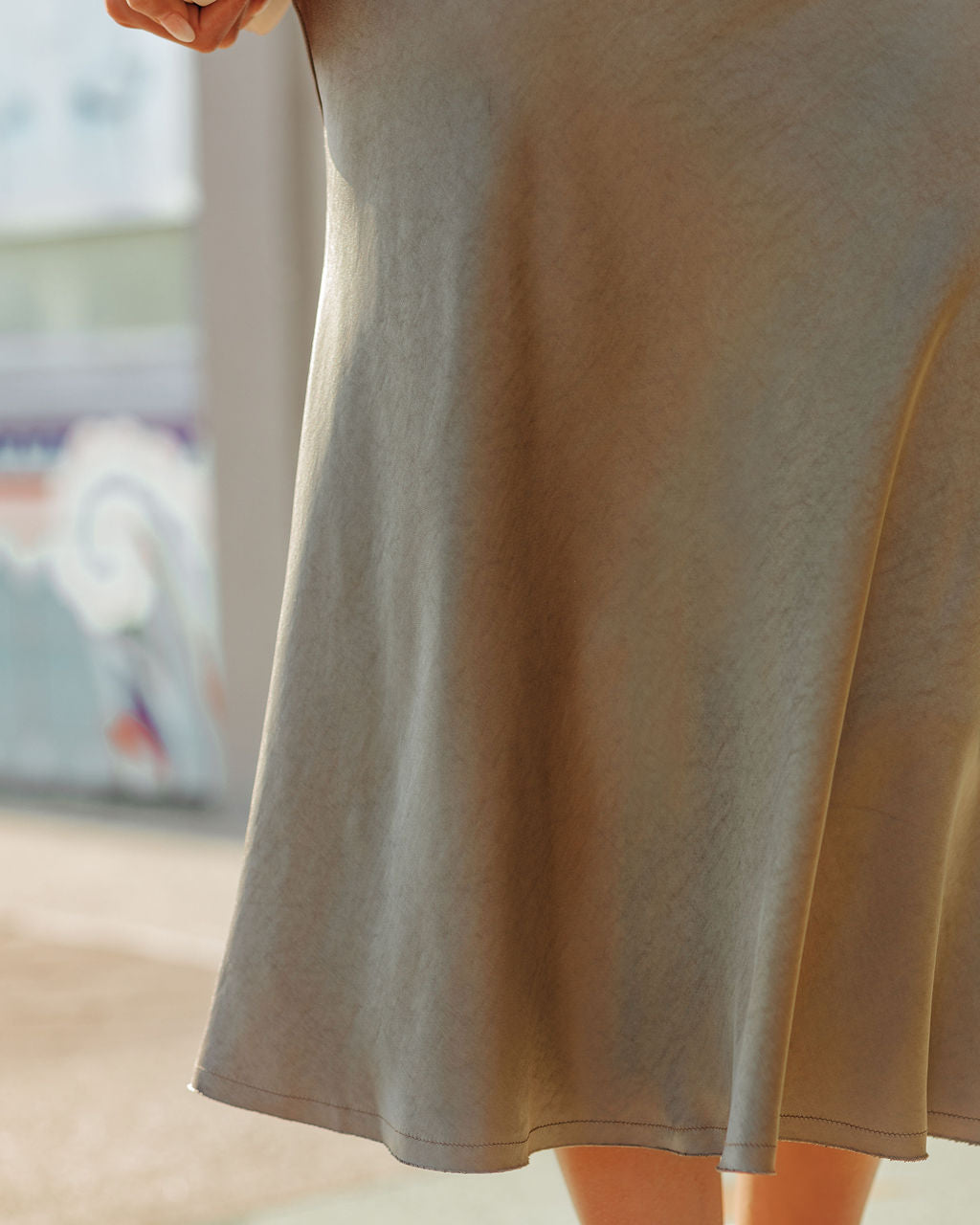 Silk skirts look so chic in the office! Our Shawn Satin Midi Skirt comes in a lustrous olive hue. Designs with an elastic waistband and no closures. Wear this midi with a collared blouse and heels. Styled with the Perfect Hoop Earrings. 5 Disc Choker. Chloe Mini Necklace. Gaia Coin Necklace. Simple Bangle Bracelet. Commitment Satin Blouse. Stella Crossbody Envelope Zip Clutch. and Ritz Faux Suede Pointed Heel.