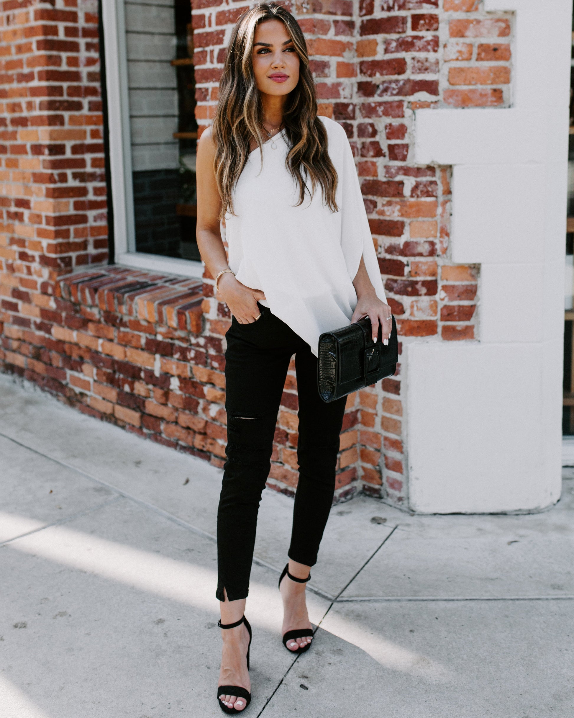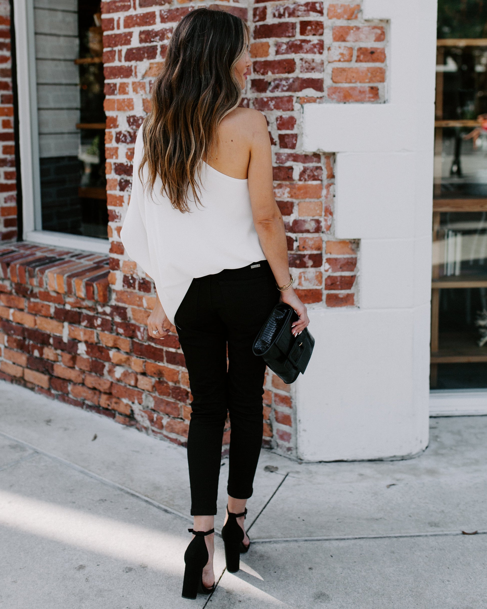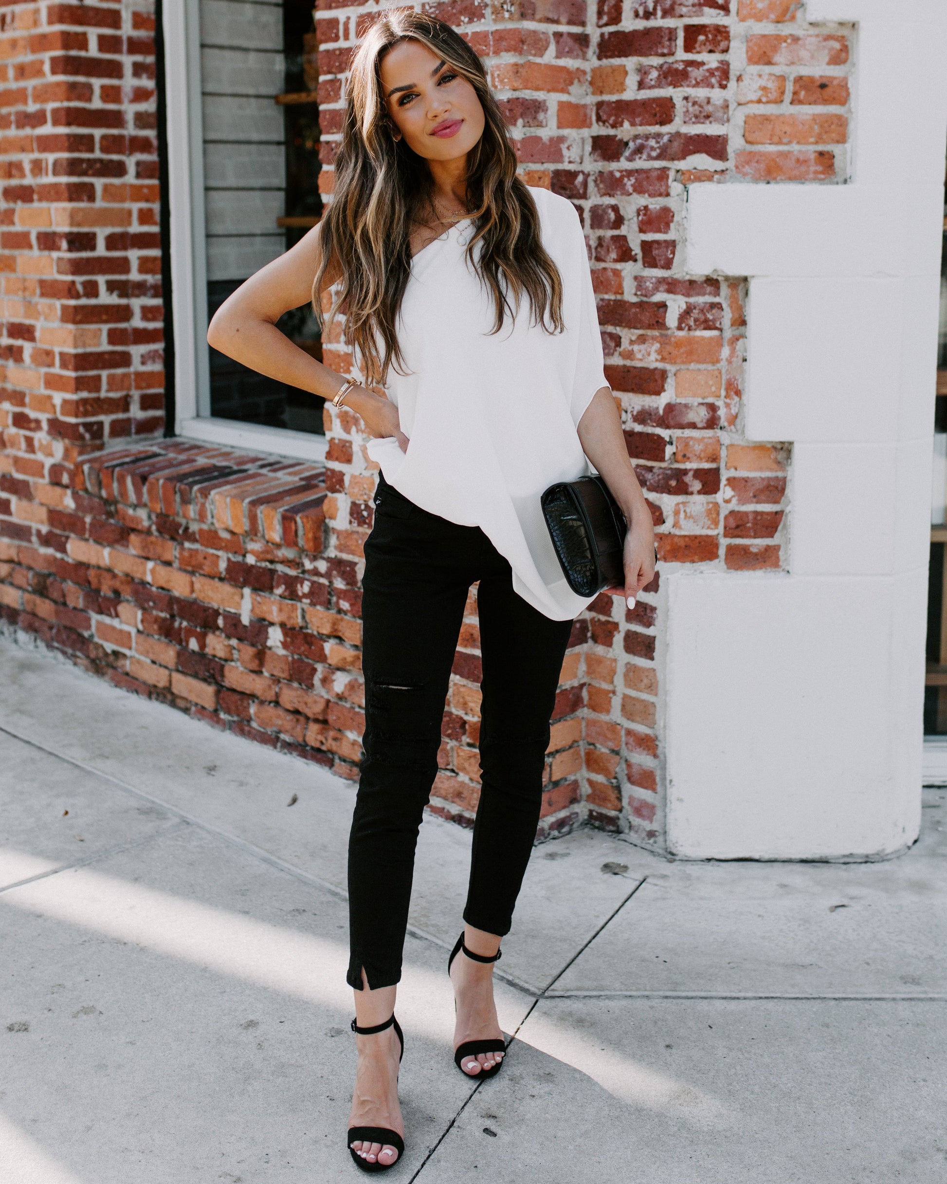 //Best Seller//New Color// The Shower With Love One Shoulder Blouse in white features a one shoulder neckline that drapes effortlessly into an elastic waistband for a dramatic touch.