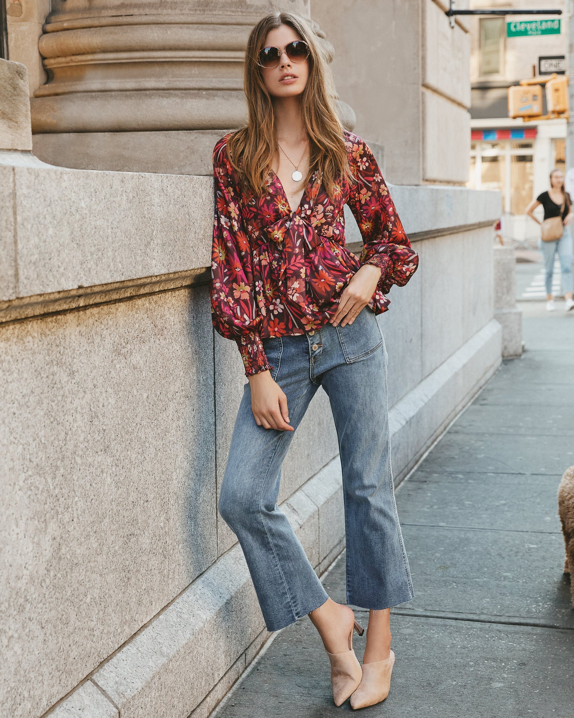 //InsStreet Exclusive// Every Fall Wardrobe needs a boho blouse! Our Village Views Floral Tie Front Babydoll Blouse comes in rust with brown. purple. pink. coral. lime. blush. grey. orange. and fuschia florals. Designed with a tie front. Styled with the French Twist Hoops. Emperor Coin Necklace. Jevon High Rise Button Front Kick Flare Denim. and Tip Top Faux Suede Kitten Heel Mule.