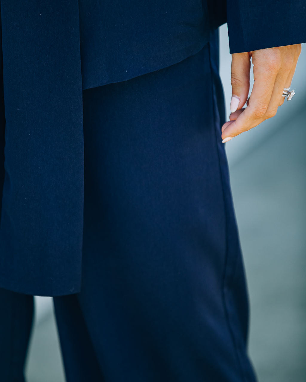 This suit set is so powerful! Our Vina Pocketed High Rise Wide Leg Trousers are a gorgeous navy color with a high rise and a wide pant leg. Wear these bossy pants look with the matching blazer and nude colored heels. Styled with the Paradiso Sunglasses. Mica Chain Choker. Patron Layered Herringbone Necklace. Elena Pendant Necklace. Chic Crossbody Chain Pouch Bag. Vina Pocketed Tie Blazer. and Whimsy Heel.