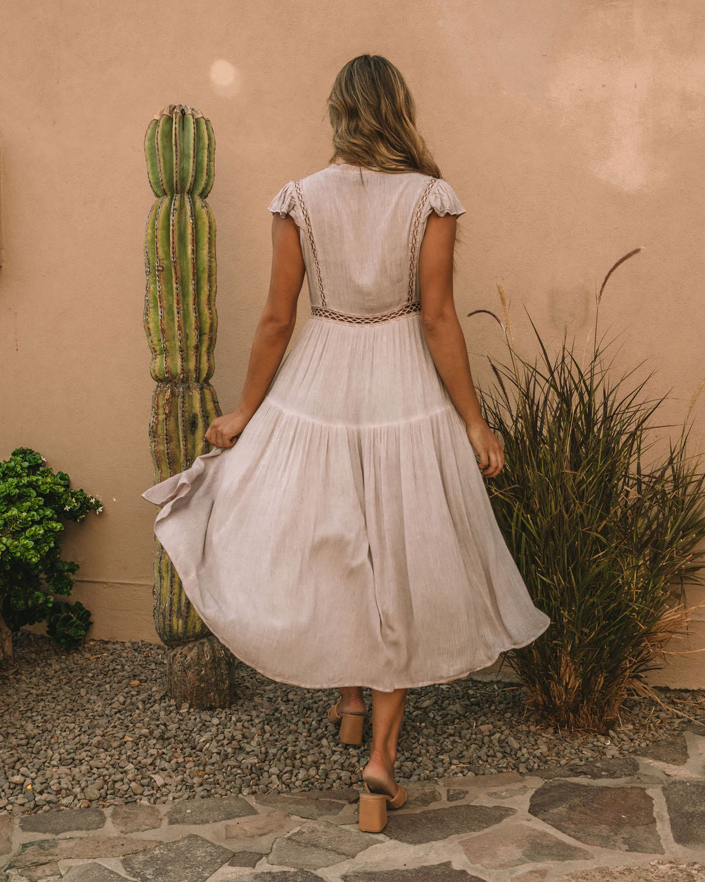 //InsStreet Exclusive//Best Seller//New Color// Major festival vibes in our Wandering Soul High Low Crochet Tunic! This mauve high low tunic features cap sleeves and a crochet trim. Front button closures align the front of this bohemian piece. Styled with the The Buddha Wheel Necklace. Wren High Rise Distressed Denim Shorts. and Twiggy Criss Cross Heeled Sandal.