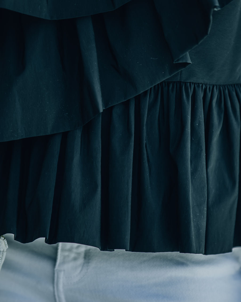//InsStreet Exclusive// Go out for drinks in our Wayne One Shoulder Ruffle Top! This black one shoulder top is designed with a structured waist and a cascading ruffle silhouette. Finished with a concealed side zipper closure. Styled with the Moxie Simple Chain Necklace. Simple Bangle Bracelet. Split Leaf Handmade Beaded Crossbody Clutch. Santa Cruz High Rise Distressed Denim Shorts. and Whimsy Heel.
