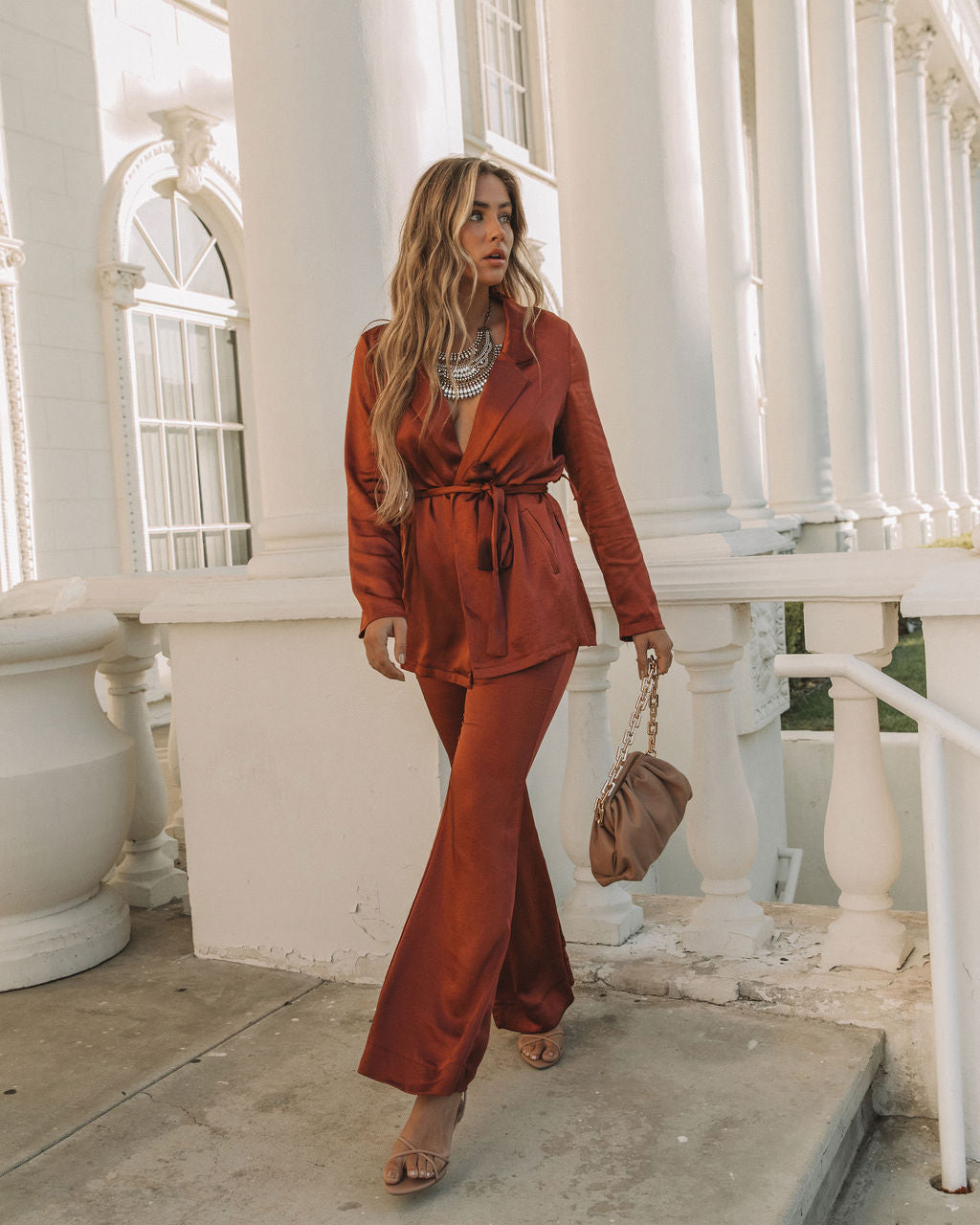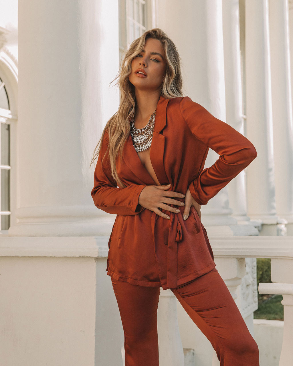 Exude elegance in a silk set! Our Whitley Pocketed Satin Tie Blazer comes in a gorgeous brick hue. Crafted with side pockets and side slits. Pair this blazer with the matching pants and strappy heels. Styled with the Rock N Rage Statement Necklace. Chic Crossbody Chain Pouch Bag. Whitley Satin High Rise Trousers. and Bella Faux Leather Strappy Kitten Heel.