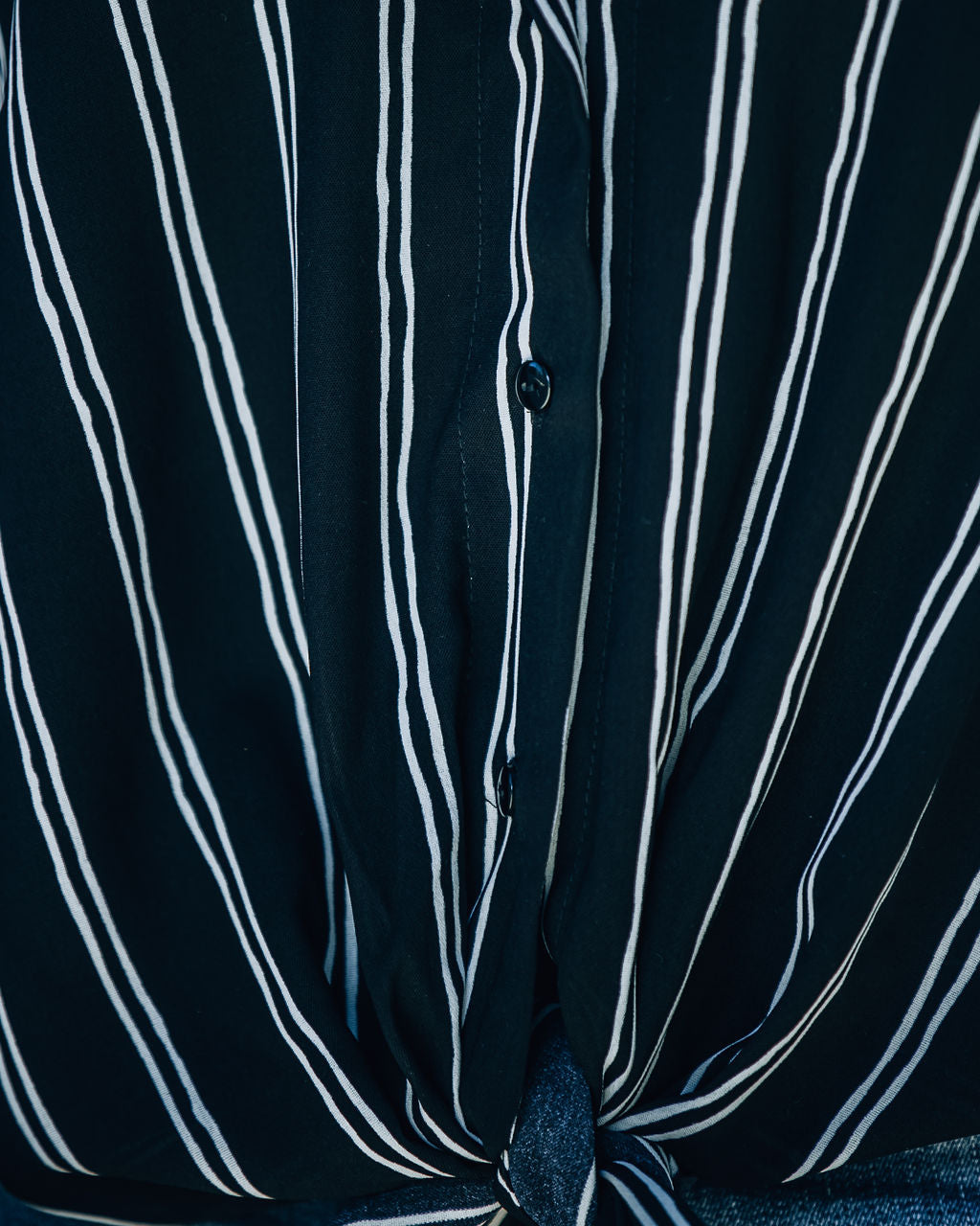 Be the best dressed in the office in our Xara Striped Button Down Blouse! This black and white top features a tie front hemline. Designed with a collar and dolman sleeves. Finished with front button closures. Styled with the Carson Black Frame Dark Smoke Polarized Sunglasses. Chloe Mini Necklace. Initial Card Necklace. Simple Bangle Bracelet. Stella Crossbody Envelope Zip Clutch. Tilley Frayed Ankle High Waisted Skinny. and Whimsy Heel.