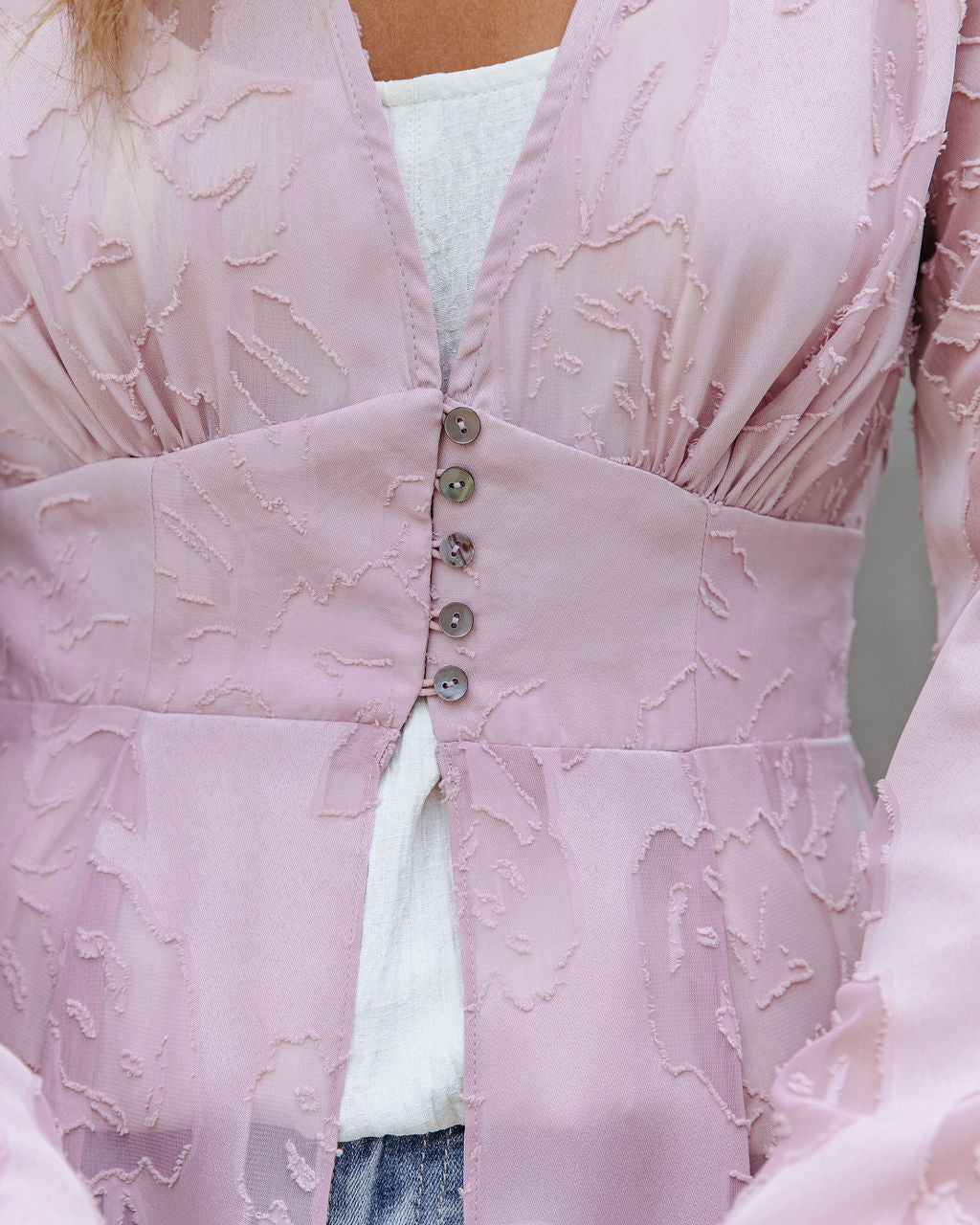 Catch feelings for our You Make Me Feel Textured Duster! This mauve textured piece is designed with a fitted waist and long sleeves. A deep v-neckline and button closures align the front. Styled with the Perfect Hoop Earrings. Chloe Mini Necklace. Compass Coin Necklace. Elena Pendant Necklace. Simple Bangle Bracelet. Stella Crossbody Envelope Zip Clutch. Parachute Woven Scoop Tank. Mcguire High Rise Distressed Denim. and Ritz Faux Suede Pointed Heel.