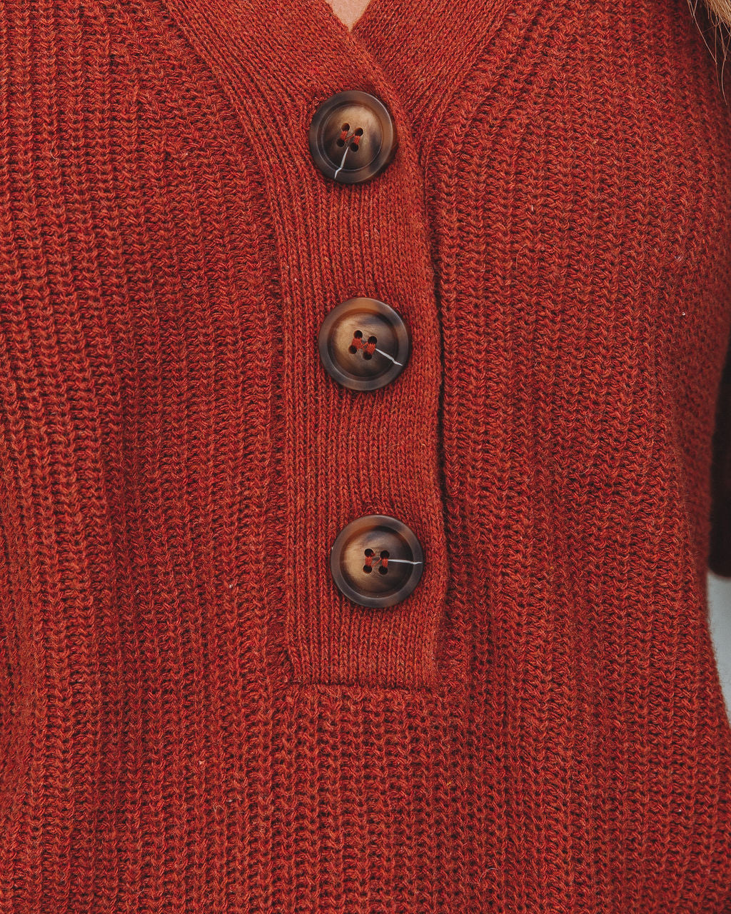 Spend all day baking in our Zev Knit Henley Sweater! This brick colored sweater features front button closures. Designed with side slits and a relaxed fit. The perfect casual piece! Styled with the El Dorado Hat. Perfect Hoop Earrings. Chloe Mini Necklace. Ultimate High Rise Split Ankle Distressed Skinny. and Conquest Heeled Shearling Lace Up Boot.